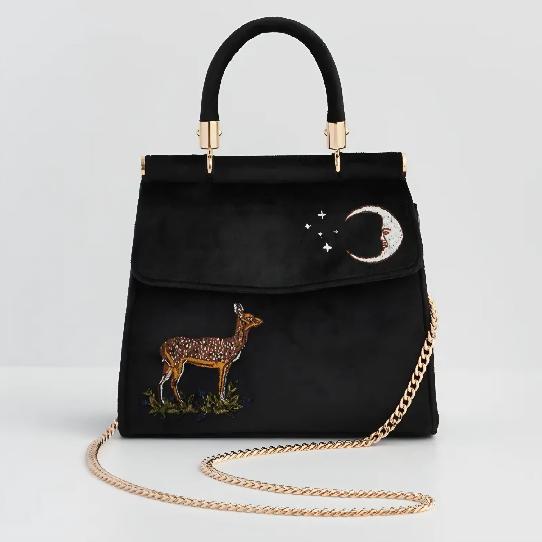 Transform your everyday ensemble with the enchanting Deer & Moon Embroidered Black Velvet Tote, a stunning accessory that exudes timeless elegance. The tote is expertly crafted from sumptuous black velvet that adds a touch of sophistication. Adorned with meticulously detailed embroidery, the design features a serene deer gently standing beneath a delicate crescent moon, creating a whimsical connection to nature and the night sky. Its structured silhouette offers a refined style, complemented by a comfortable top handle and an optional crossbody strap for versatile carrying options. This exquisite tote seamlessly marries style with functionality, making it the perfect companion for any outing.