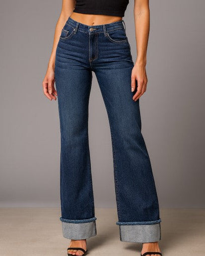 A bold oversized cuffed hem detail gives the silhouette a signature look-elevating the classic low-rise fit with modern attitude. Finished with clean lines, flawless stitching, and a flattering wide leg fit, these jeans pair effortlessly with heels, boots, or your everyday essentials.