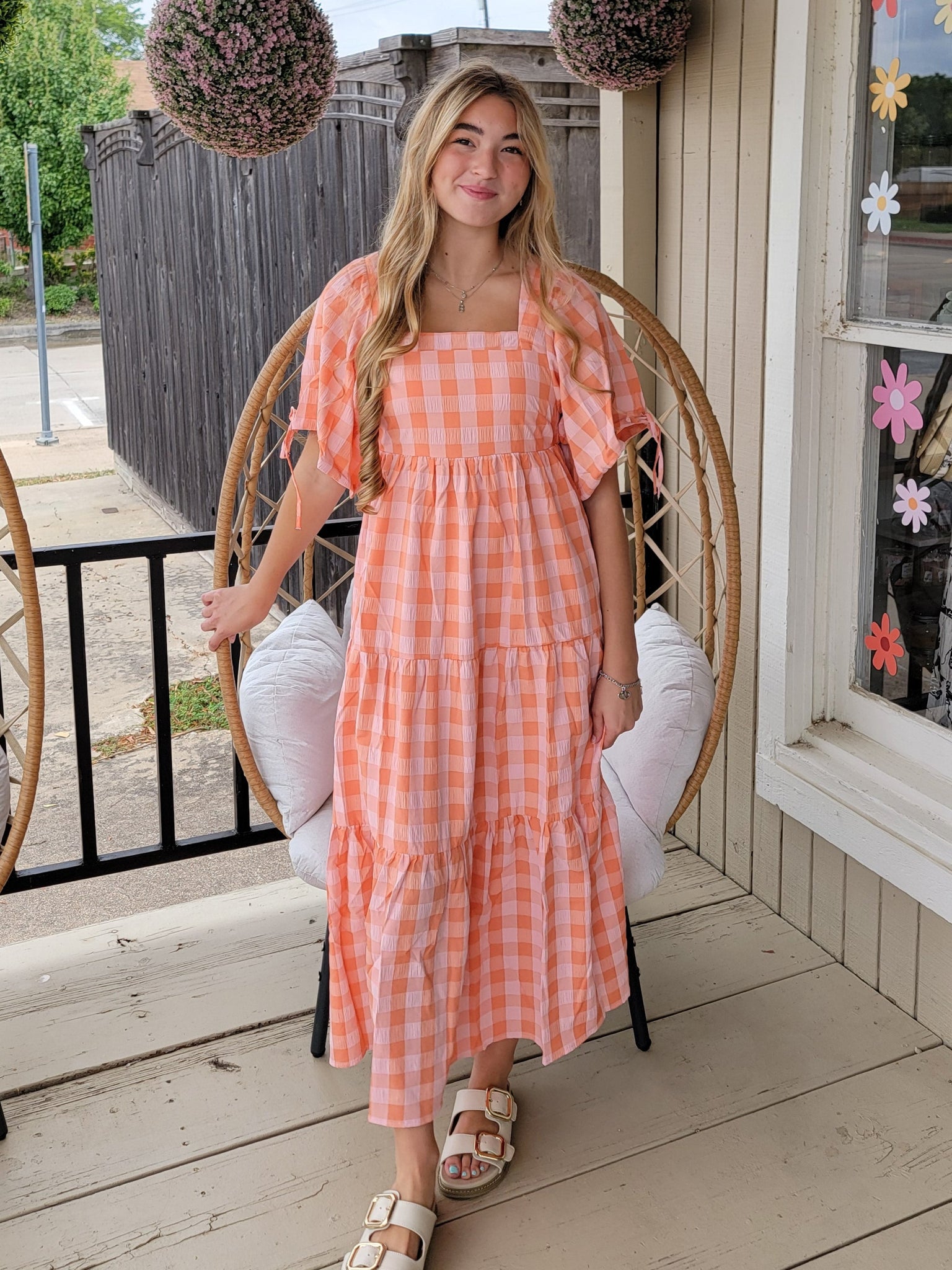 Women's multi color tiered checkered square neck puff sleeve with tassel tie with pockets. Designed with a smocked back for a comfortable wear.