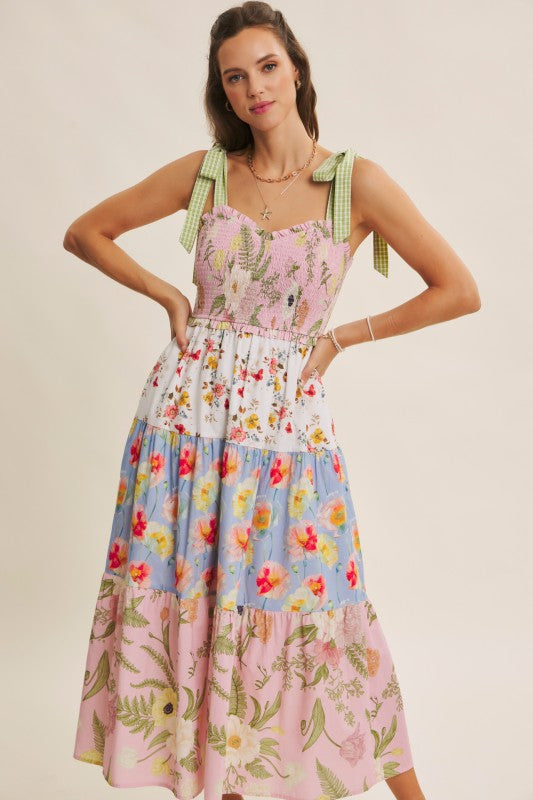 Mixed floral tiered midi dress with smocked sweetheart bodice and gingham